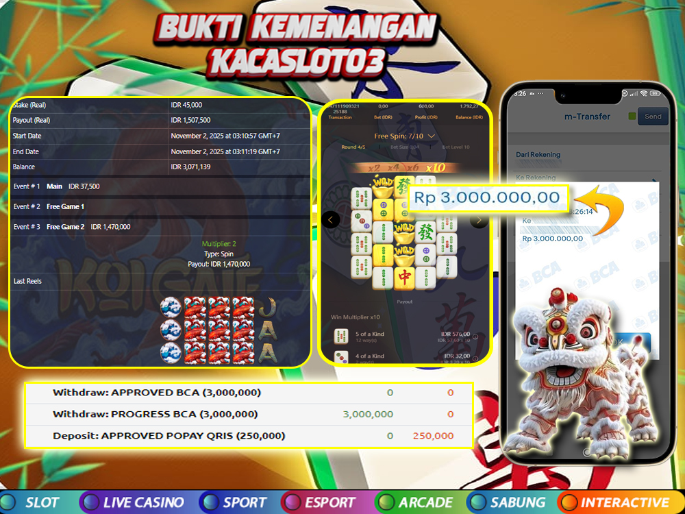 Selamat Kepada ID : A**123 Atas Withdraw Rp. 3,000,000 Juta Hari ini. Ditunggu Withdraw Selanjutnya dan ajak juga teman temannya bergabung di Kacaslot03