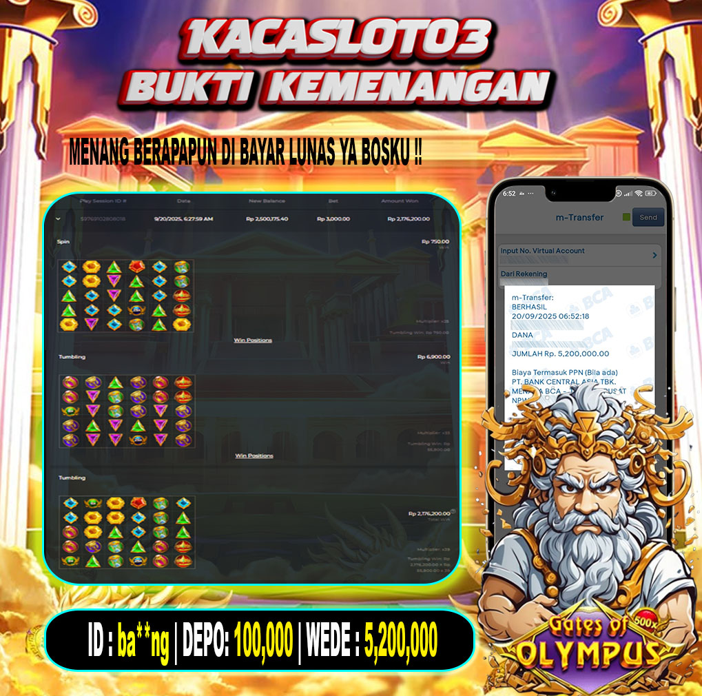 Selamat Kepada ID : ba**ng Atas Withdraw Rp. 5,200,000 Juta Hari ini. Ditunggu Withdraw Selanjutnya dan ajak juga teman temannya bergabung di Kacaslot03