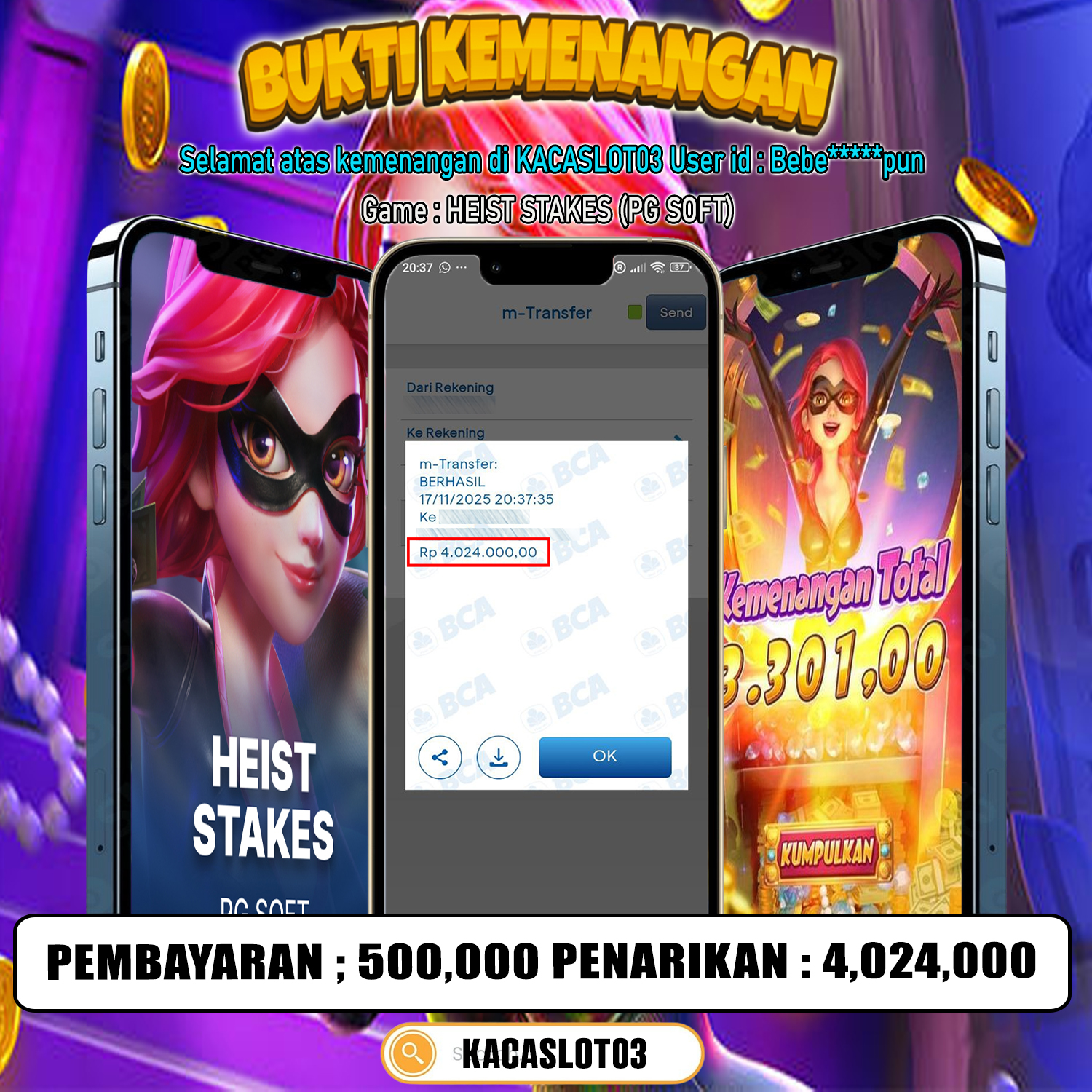 Selamat Kepada ID : Beb****pun Atas Withdraw Rp. 4,024,000 Juta Hari ini. Ditunggu Withdraw Selanjutnya dan ajak juga teman temannya bergabung di Kacaslot03