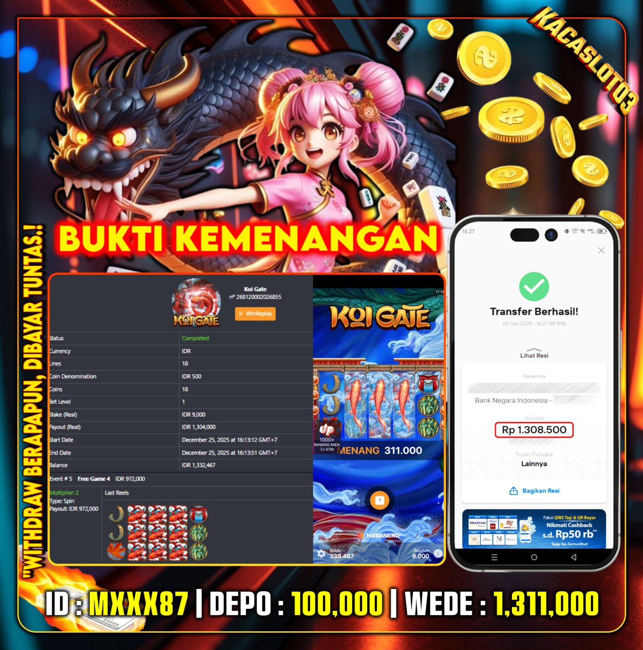 Selamat Kepada ID : Mar***87 Atas Withdraw Rp. 1,311,000 Juta Hari ini. Ditunggu Withdraw Selanjutnya dan ajak juga teman temannya bergabung di Kacaslot03