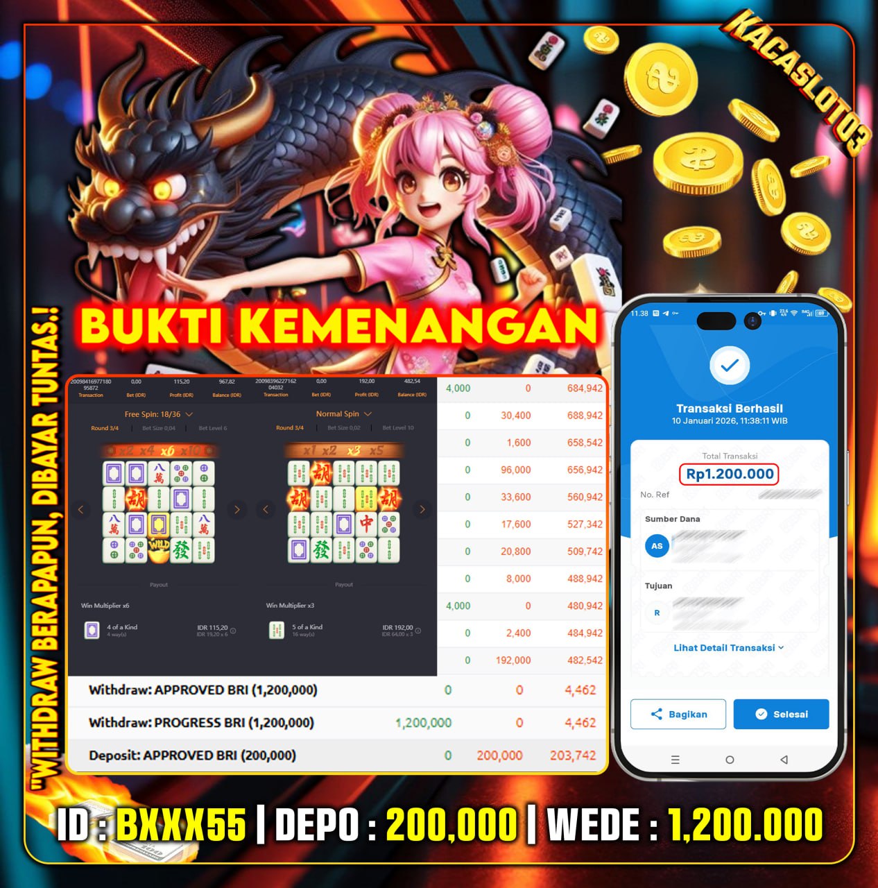 Selamat Kepada ID : Bilq***55 Atas Withdraw Rp. 1,200.000 Juta Hari ini. Ditunggu Withdraw Selanjutnya dan ajak juga teman temannya bergabung di Kacaslot03