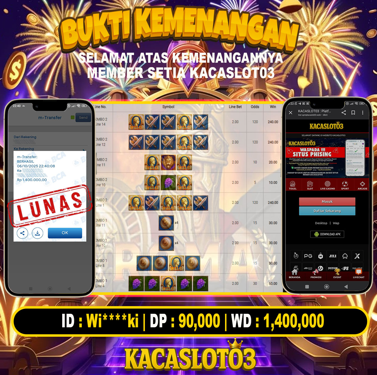 Selamat Kepada ID : mr******77 Atas Withdraw Rp.1,000.000 Juta Hari ini. Ditunggu Withdraw Selanjutnya dan ajak juga teman temannya bergabung di Kacaslot03