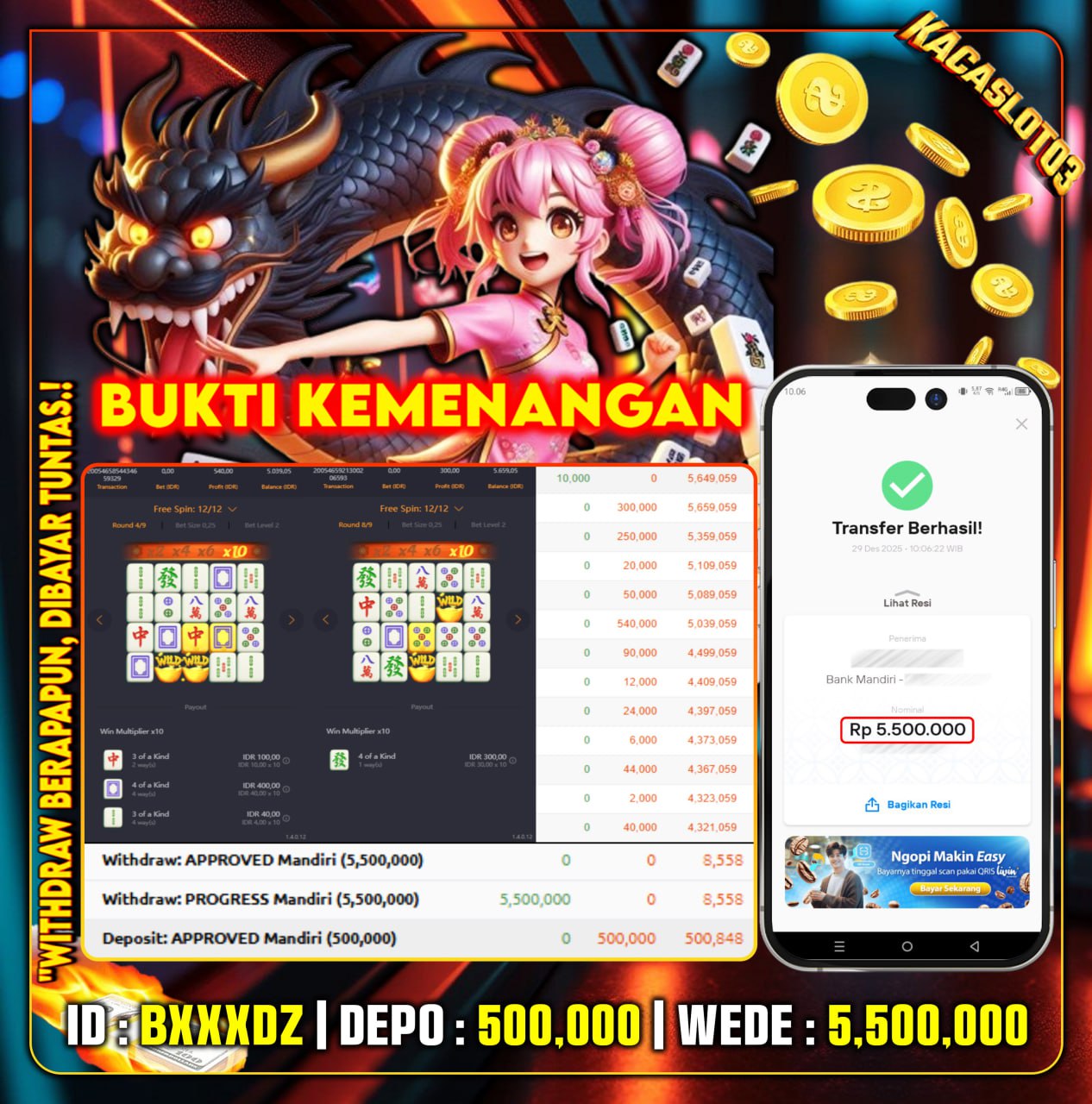 Selamat Kepada ID : Bo***dz Atas Withdraw Rp. 5,500,000  Juta Hari ini. Ditunggu Withdraw Selanjutnya dan ajak juga teman temannya bergabung di Kacaslot03
