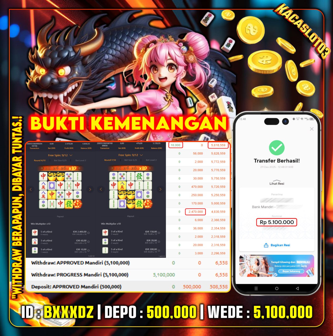 Selamat Kepada ID : Bo***dz Atas Withdraw Rp. 5,100.000 Juta Hari ini. Ditunggu Withdraw Selanjutnya dan ajak juga teman temannya bergabung di Kacaslot03
