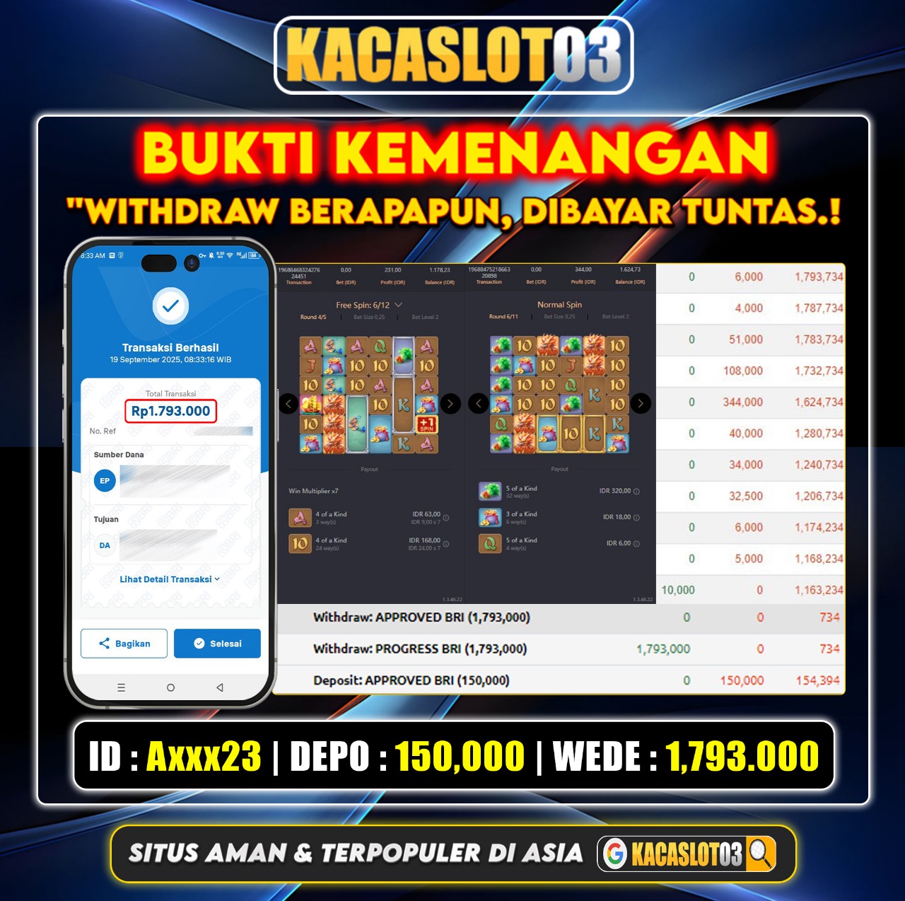 Selamat Kepada ID : Al****23 Atas Withdraw Rp. 1,793.000 Juta Hari ini. Ditunggu Withdraw Selanjutnya dan ajak juga teman temannya bergabung di Kacaslot03