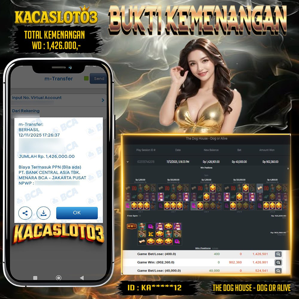 Selamat Kepada ID : Ka******12 Atas Withdraw Rp. 1,426.000 Juta Hari ini. Ditunggu Withdraw Selanjutnya dan ajak juga teman temannya bergabung di Kacaslot03