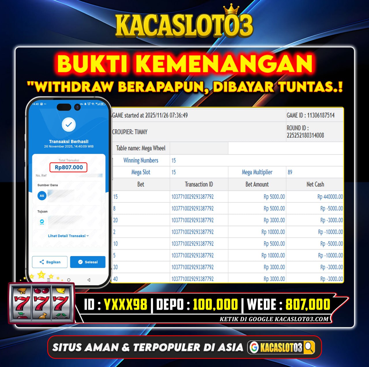Selamat Kepada ID : Yh***8 Atas Withdraw Rp. 807,000 Juta Hari ini. Ditunggu Withdraw Selanjutnya dan ajak juga teman temannya bergabung di Kacaslot03