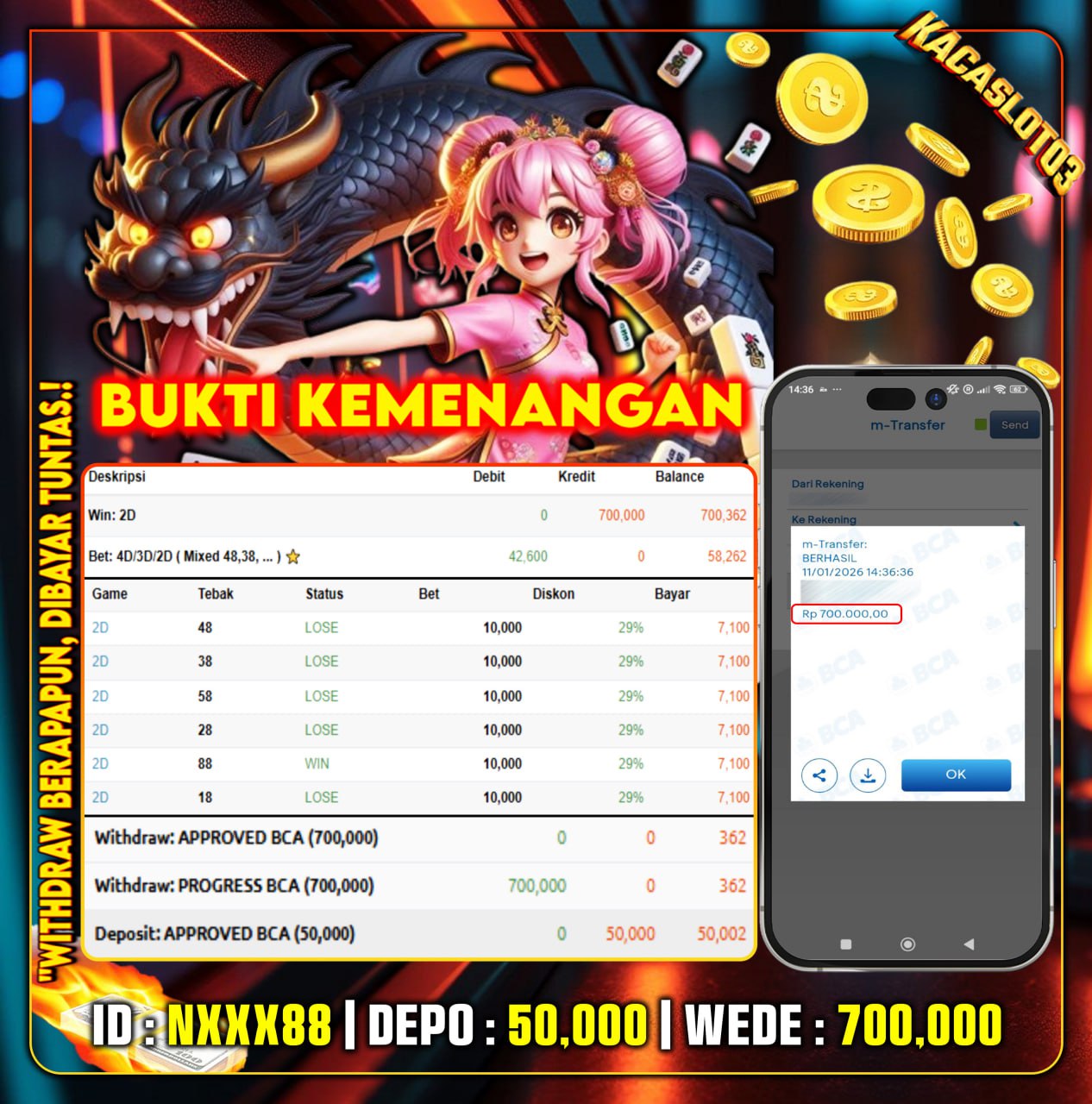 Selamat Kepada ID : Nd***88 Atas Withdraw Rp. 700,000 Juta Hari ini. Ditunggu Withdraw Selanjutnya dan ajak juga teman temannya bergabung di Kacaslot03