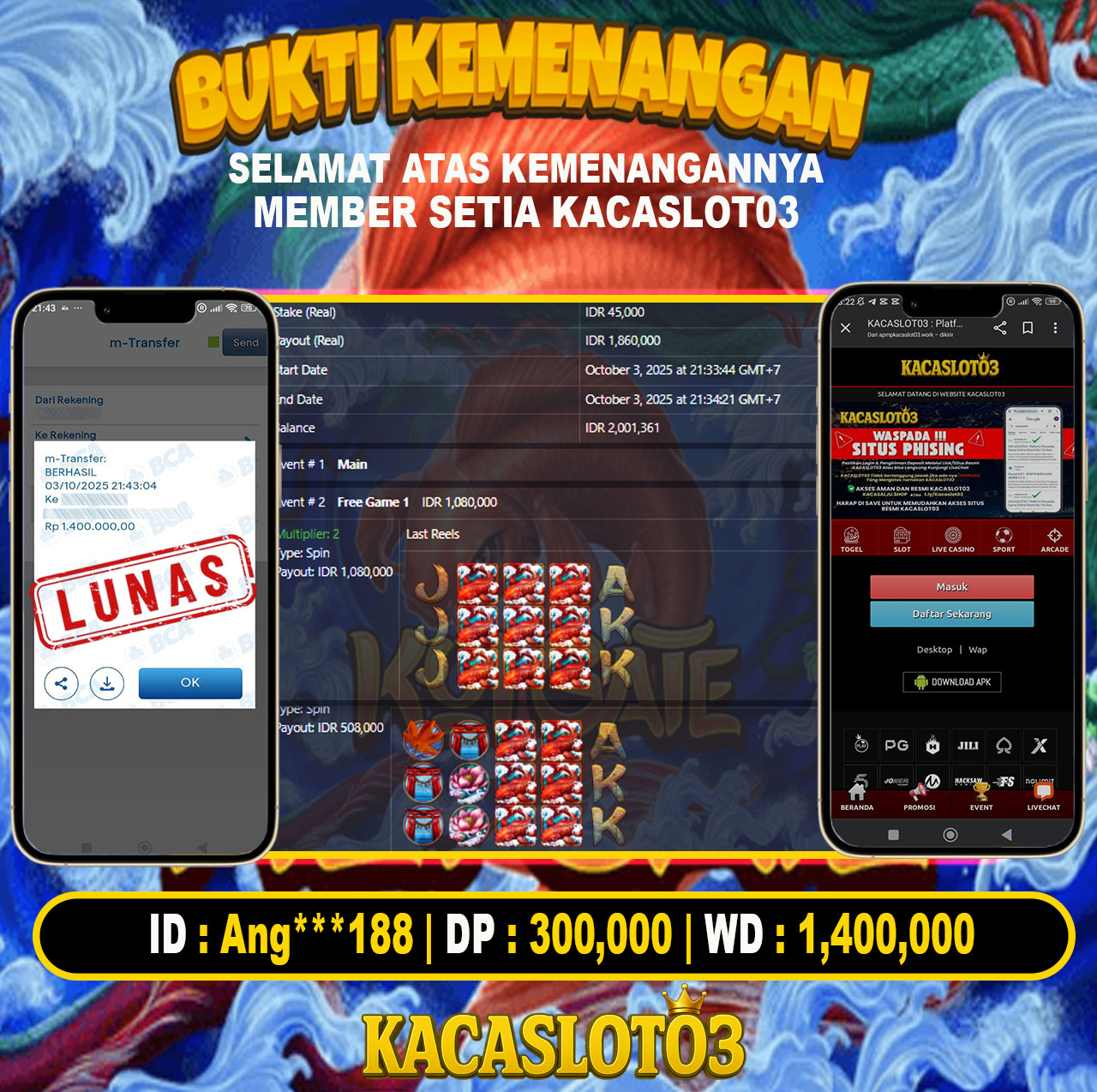 Selamat Kepada ID : De****Jp  Atas Withdraw Rp. 2,700,000  Juta Hari ini. Ditunggu Withdraw Selanjutnya dan ajak juga teman temannya bergabung di Kacaslot03