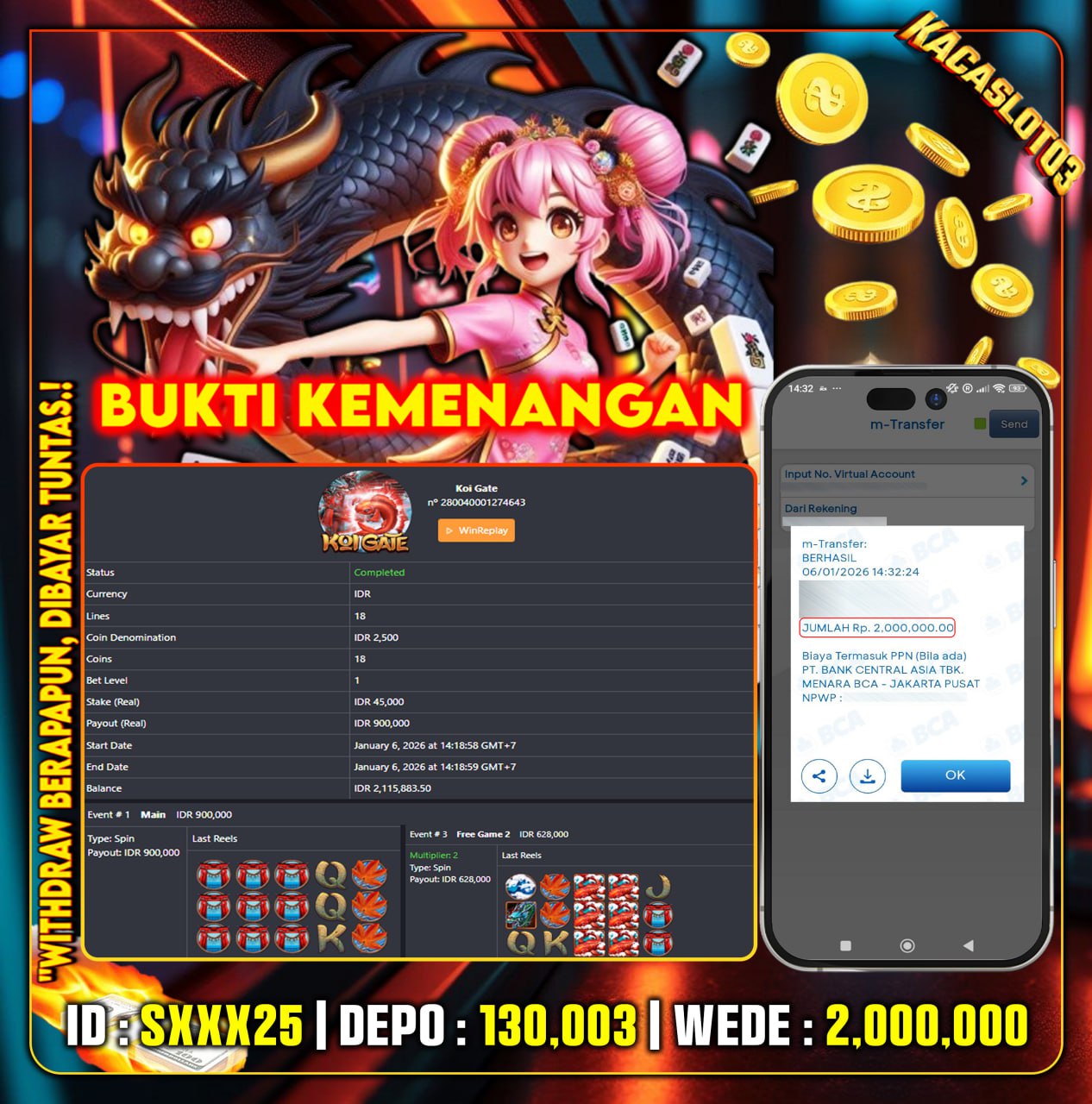 Selamat Kepada ID : Du**22 Atas Withdraw Rp. 1,600,000 Juta Hari ini. Ditunggu Withdraw Selanjutnya dan ajak juga teman temannya bergabung di Kacaslot03